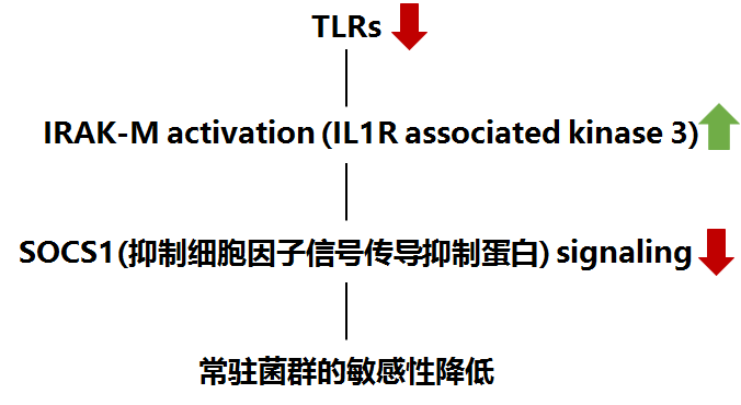 機(jī)體與皮膚常住菌群的長期互作,通過病原體相關(guān)分子模式皮膚表面的模式識(shí)別受體的特異性識(shí)別,減少TLR受體在細(xì)胞表面的表達(dá)以及激活白介素相關(guān)激活酶3(IRAK-M),通過抑制抑制細(xì)胞因子信號(hào)傳導(dǎo)抑制蛋白(SOCS1)的表達(dá),達(dá)到降低常駐菌群敏感性的目的。