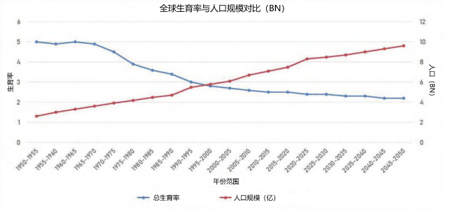 圖1 | 全球生育率與人口規(guī)模(BN),1950-2050