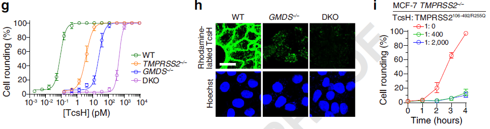 TMPRSS2 由于廣泛參與了包括流感、SARS、MERS 等在內(nèi)的多種病毒的細(xì)胞入侵而“臭名昭著”。TMPRSS2 參與病毒入侵的方式是通過其絲氨酸蛋白酶活性激活病毒的刺突蛋白,從而促進(jìn)膜融合。有意思的是,TMPRSS2 的絲氨酸蛋白酶活性與其介導(dǎo) TcsH 入侵完全無關(guān)(圖2)。另一方面,TMPRSS2 可以特異性地與 TcsH 進(jìn)行結(jié)合,親和力高達(dá)0.13 nM。說明與“助攻”病毒感染的模式不同,TMPRSS2 是作為直接的蛋白受體協(xié)助毒素 TcsH 入侵靶向細(xì)胞的。